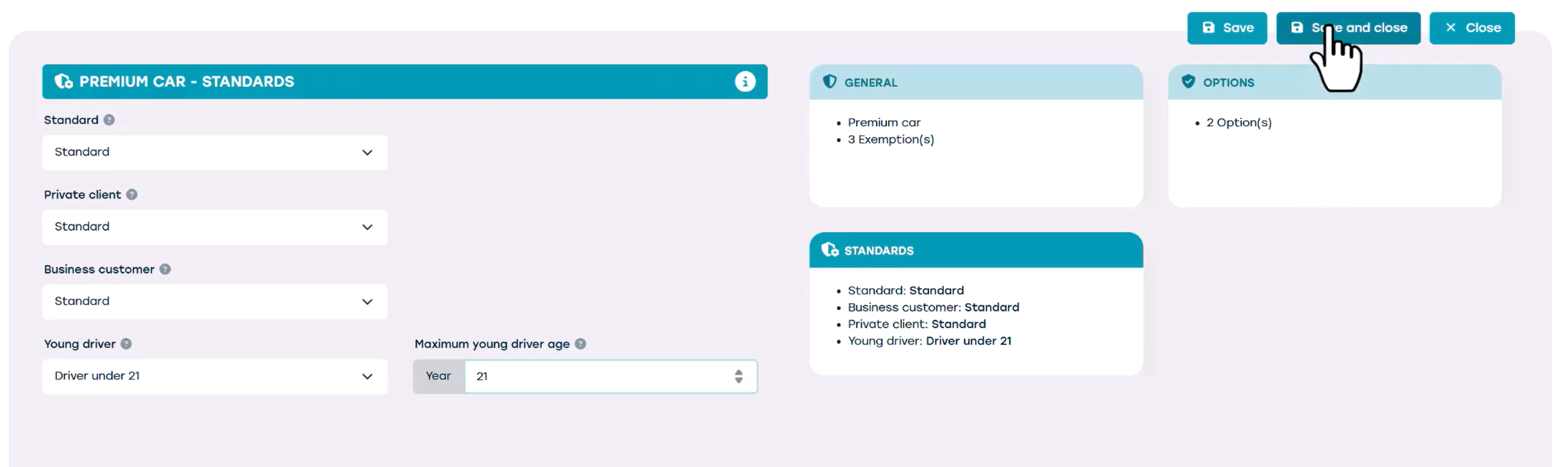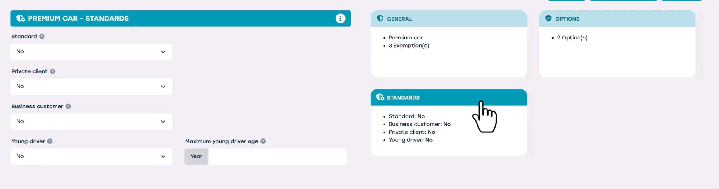 Nous avons maintenant deux options d’assurance pour les voitures premium : assurance standard et assurance pour conducteurs de moins de 21 ans. Ensuite, nous devons sauvegarder pour pouvoir accéder à la tuile « Standards » où nous pouvons choisir dans quels cas quelle option sera utilisée.