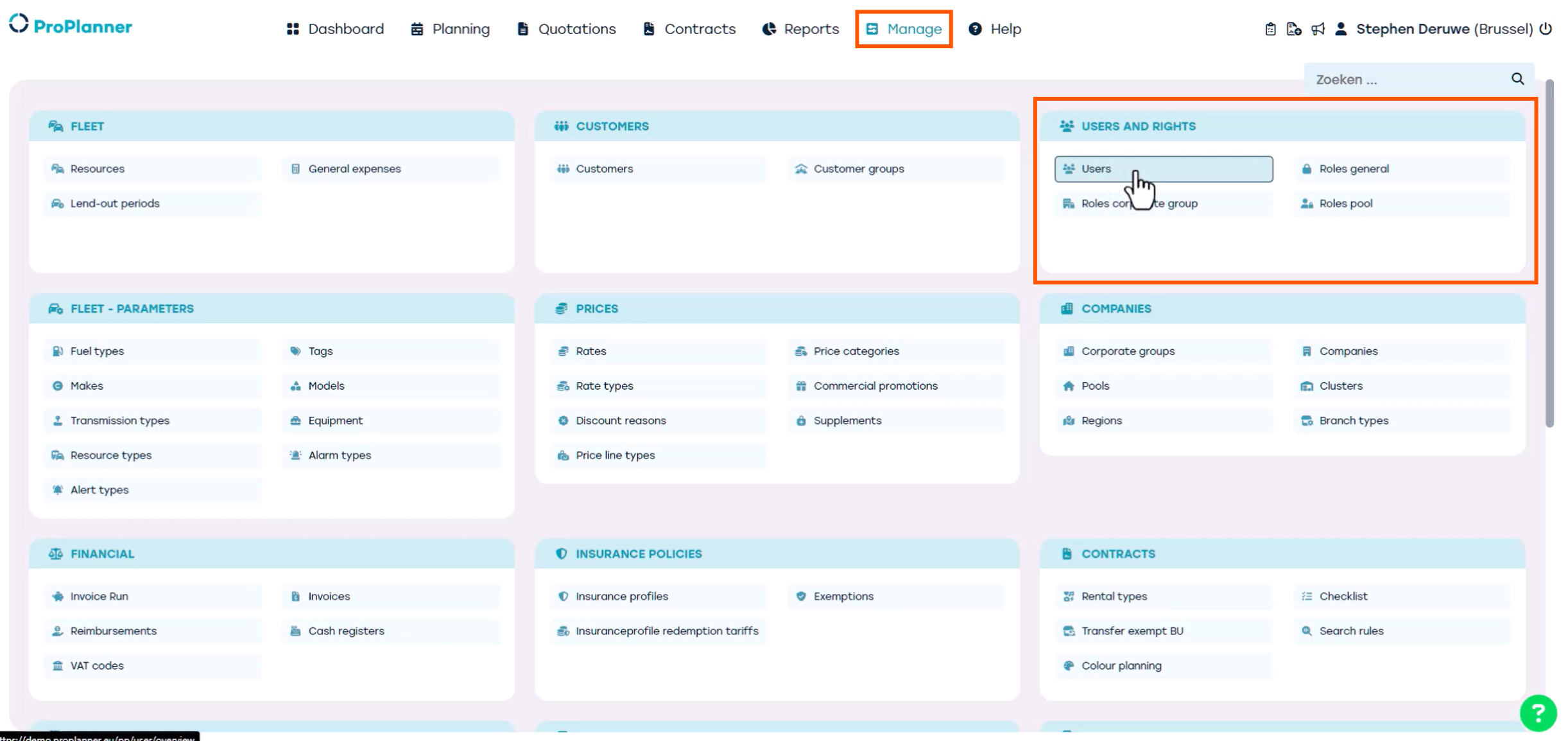 Pour attribuer des rôles à l’utilisateur, commencez par aller dans Gérer et cliquez ensuite sur « Utilisateurs » sous Utilisateur et droits.