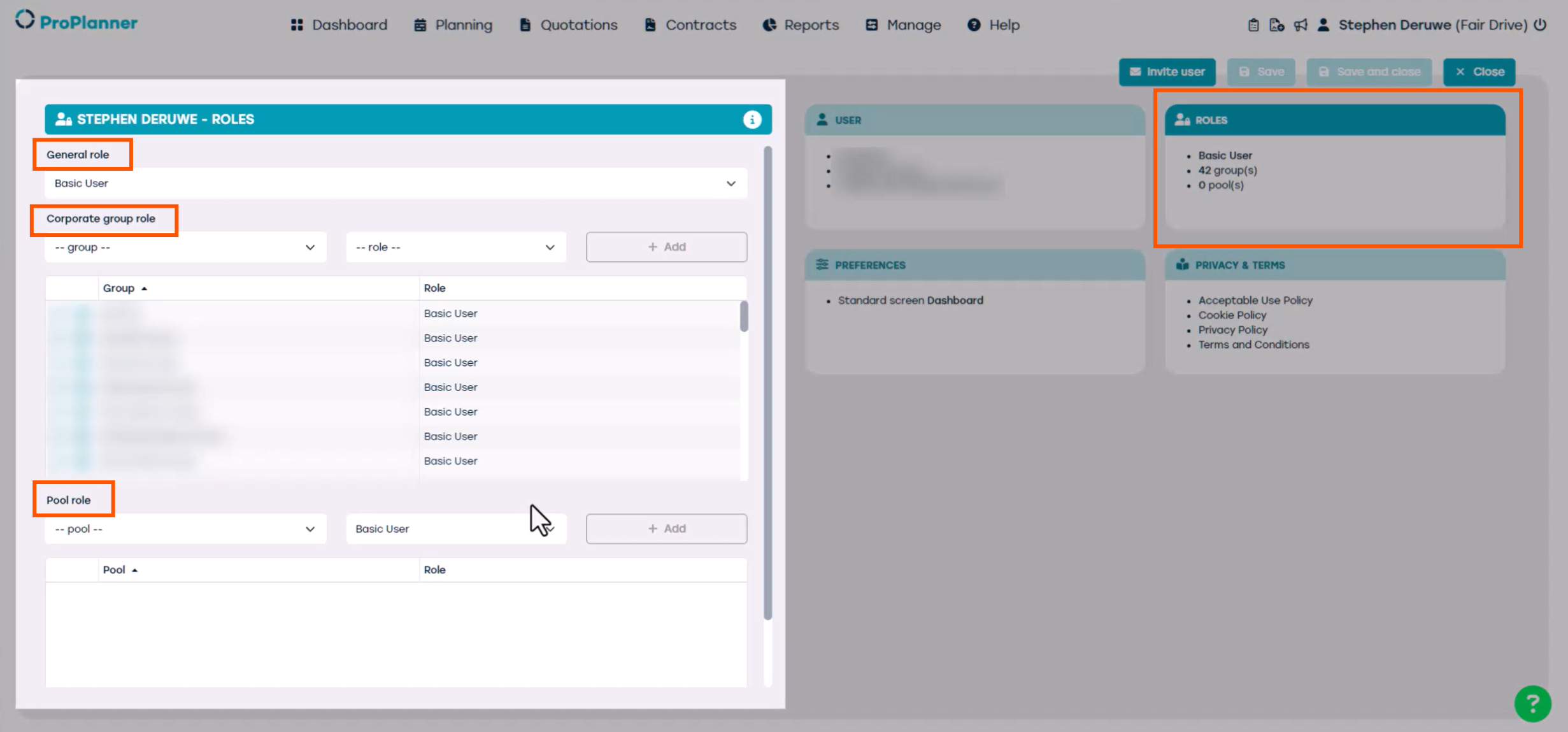 Dans notre exemple, nous voulions permettre à un nouvel utilisateur de base d’effectuer les tâches quotidiennes dans ProPlanner, nous lui attribuons donc le rôle Utilisateur de base sous Rôle de la flotte pour chaque flotte à laquelle il a besoin d’accéder.