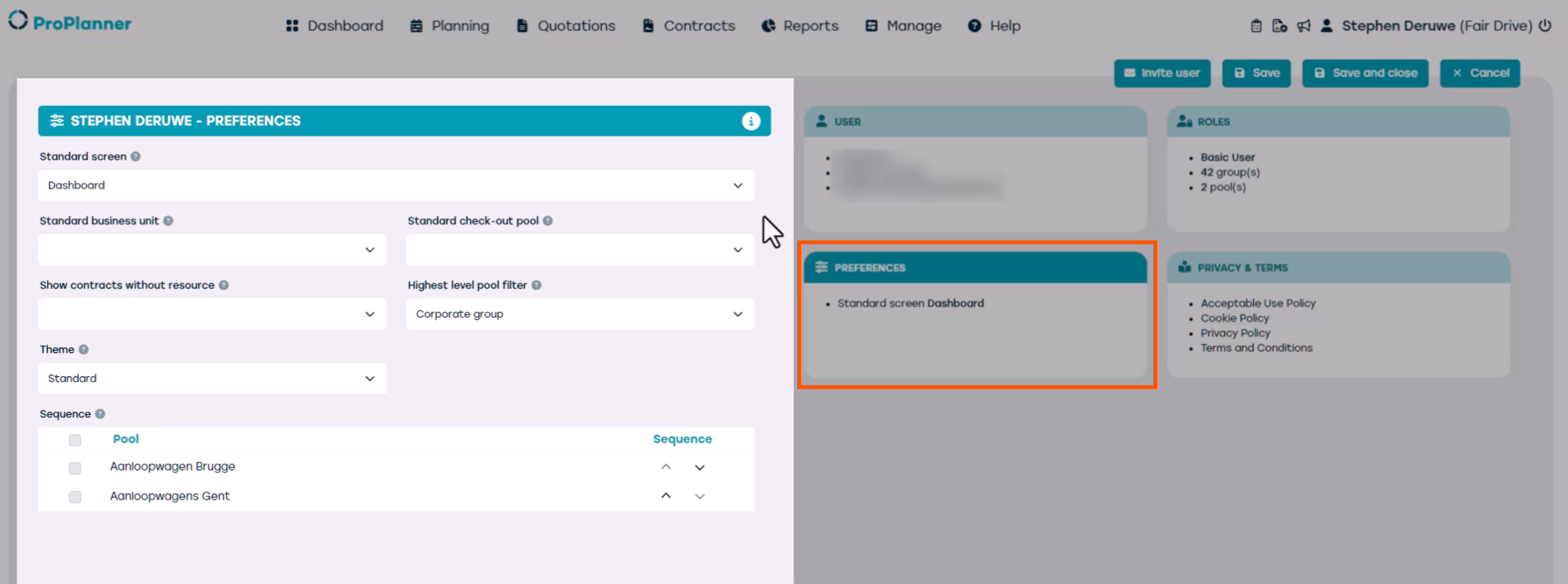 - L’écran par défaut – tableau de bord ou écran de planification, nous recommandons de le laisser sur le tableau de bord afin de ne rater aucune information importante lors de la connexion à ProPlanner.