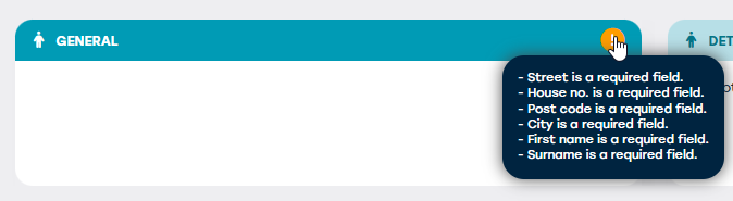 Indien een veld niet is ingevuld, wordt dit ook weergegeven in de tile waar het veld zich bevindt. De tile krijgt vervolgens ook een geel of rood icoon, afhankelijke van het type melding. Als men met de muis over dit icoon gaat, krijgt men de reden van het icoon te zien.