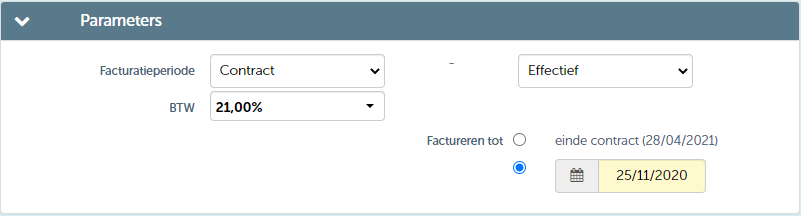 - Factureren tot einde contract: hiermee factureer je onmiddellijk de hele periode. Dit is de standaard methode als je een contract hebt berekend en factureert zonder specifieke parameters in te stellen.
