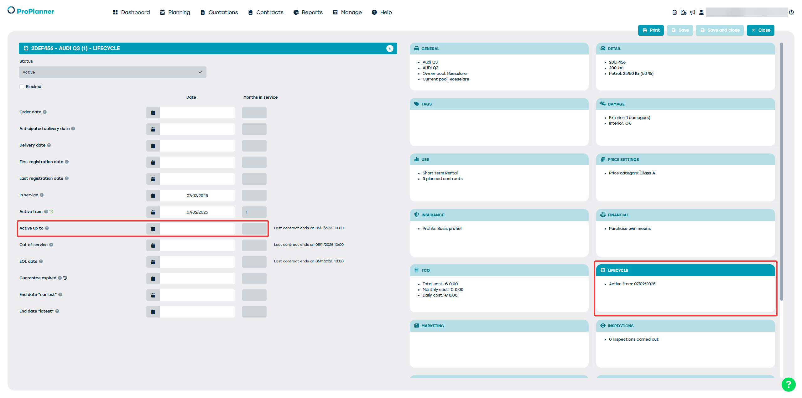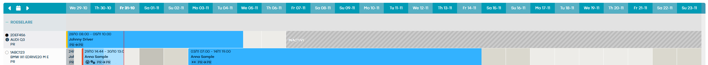 Het voertuig zal tot die datum getoond worden op de planning maar de periode na de actief tot en met datum wordt gearceerd aangeduid. Het is ook niet langer mogelijk in die periode contracten aan te maken.