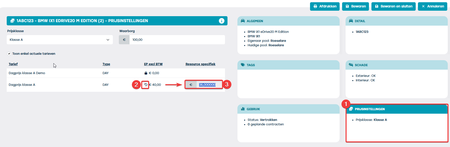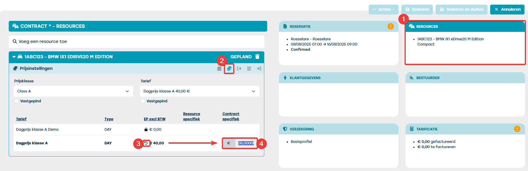 Als er een contract wordt gemaakt op deze resource en er is geen contract specifieke prijs ingesteld zullen deze prijzen worden gebruik voor deze resource. - Instellen van een contract specifieke prijs: