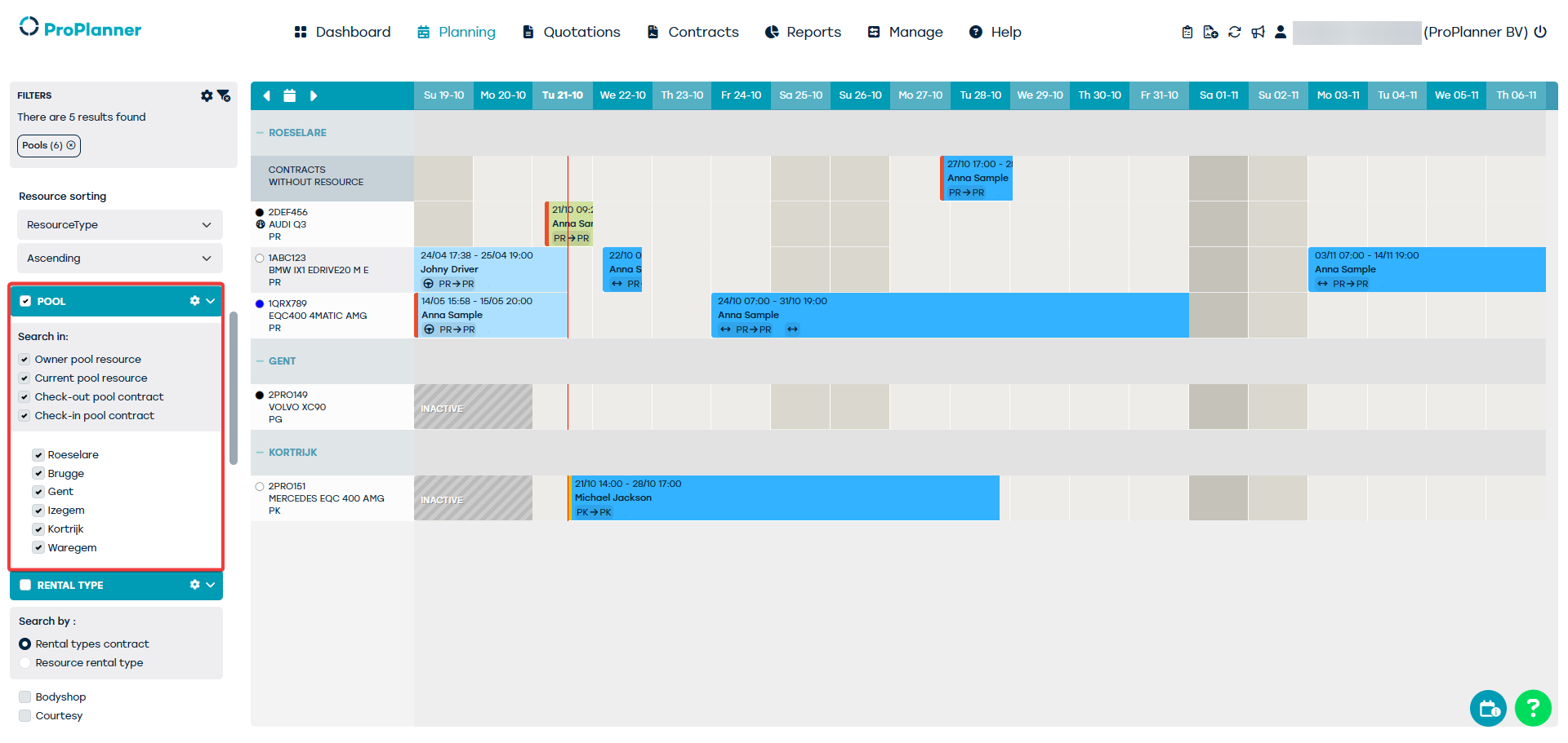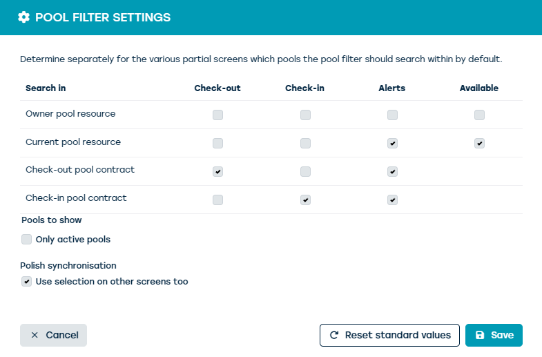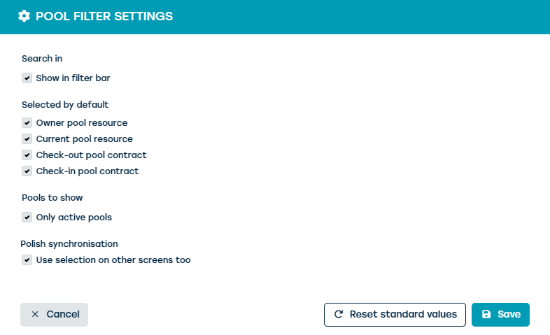 Hier kunt u voor elk deelscherm, dus ook voor de tabel met beschikbare resources, bepalen in welk soort pool de poolfilter moet zoeken. Op alle andere schermen wordt volgend venster getoond: