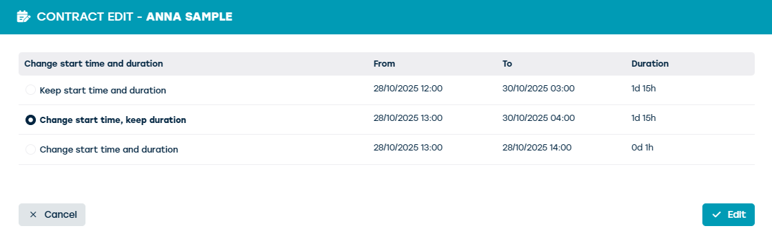 Werkt gelijkaardig als kopëren, maar met dit verschil dat het origineel contract niet gedupliceerd wordt, maar verplaatst. Er wordt bevestiging gevraagd waarbij je kan kiezen of je het contract eventueel wil aanpassen naar het tijdstip of de duur waarvoor je gesleept hebt.