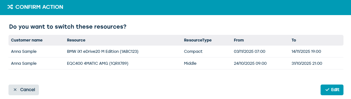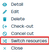 Het is ook mogelijk om 2 reservaties van plaats te verwisselen. Ga hiervoor tewerk zoals het knippen, maar in plaats van te klikken in een lege plaats in de planning, klik je rechts op een bestaande reservatie. Je krijgt een context menu waarbij je keuze hebt om de resources op de reservatie te wisselen.