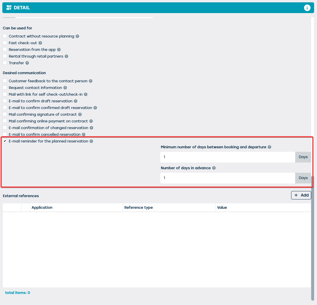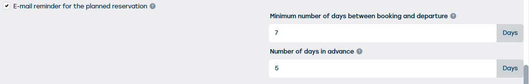 - Via de instelling "Minimum aantal dagen tussen reservatie en vertrek" kan je het versturen van een herinneringsmail tegenhouden als de datum waarop de reservatie gebeurt te kort bij de datum van het geplande vertrek ligt.