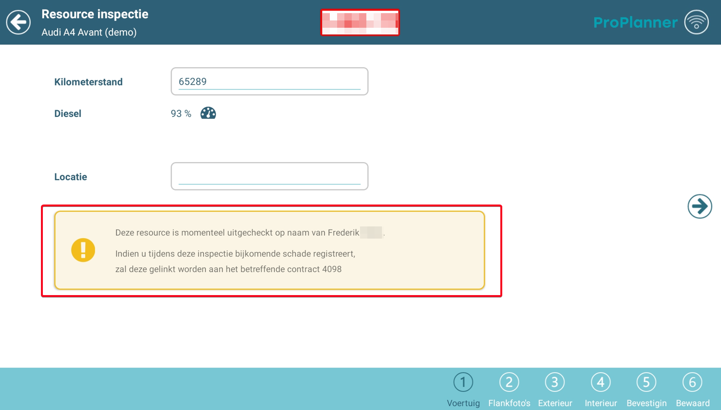 Wanneer je deze inspectie uitvoert op een uitgecheckte resource, zullen de eventuele geregistreerde schades tijdens deze inspectie ook worden bewaard op het op dat moment actieve contract waar de resource aan werd gekoppeld. Op deze manier worden zij toegewezen aan de bestuurder die op dat moment met de resource aan het rijden is. Deze schades zullen bijgevolg ook worden vermeld op het check-in document op het moment dat de resource weer wordt ingecheckt.
