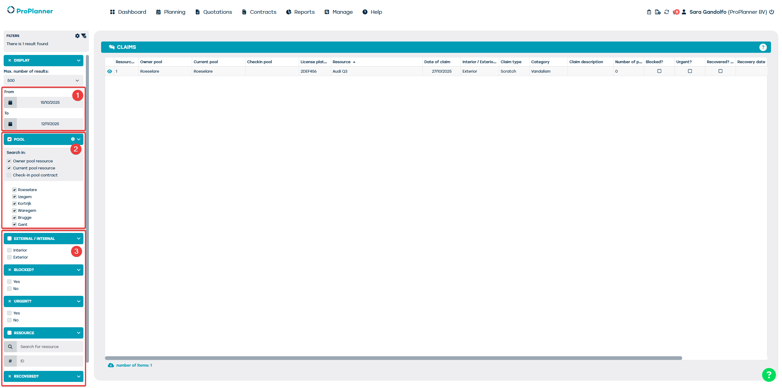 - Kan je het contract openen (opnieuw in een nieuw tabblad) waarop de schade werd geregistreerd. Dit is mogelijk door op het contractnummer te klikken.