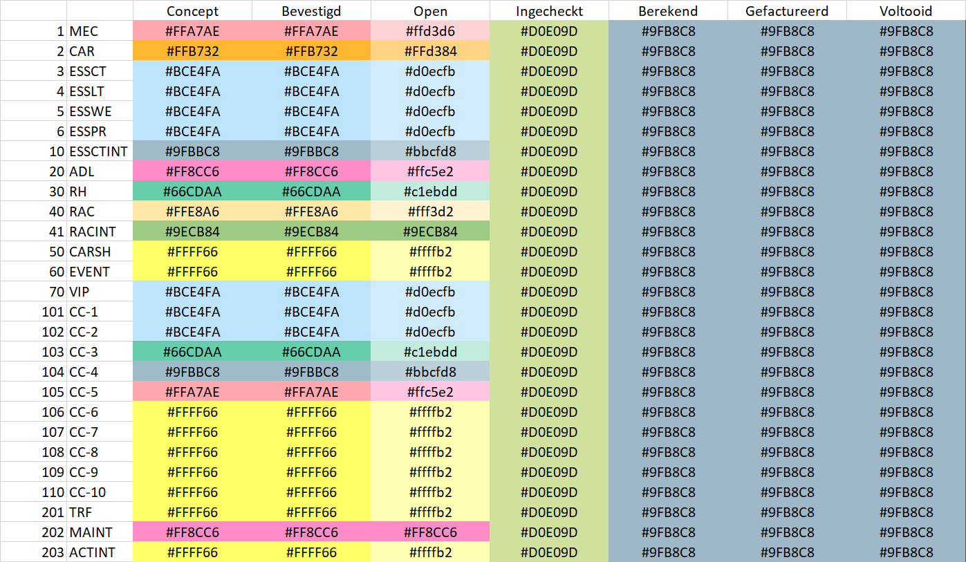 In de MOB2.0 omgeving van D'Ieteren Automotive zijn de kleuren op het planningsscherm gebaseerd op de combinatie van contractstatus en verhuurtype.