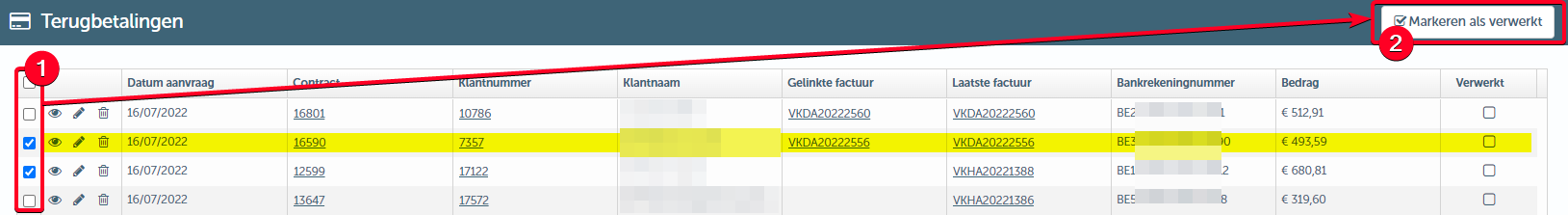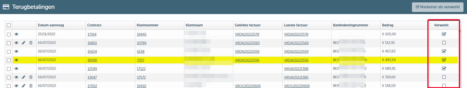 - Je selecteert de terugbetalingen die je wenst aan te duiden als "Verwerkt"