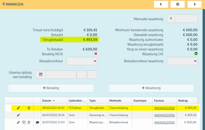 Op het betreffende contract zal de verwerkte terugbetaling automatisch als volgt worden geregistreerd: