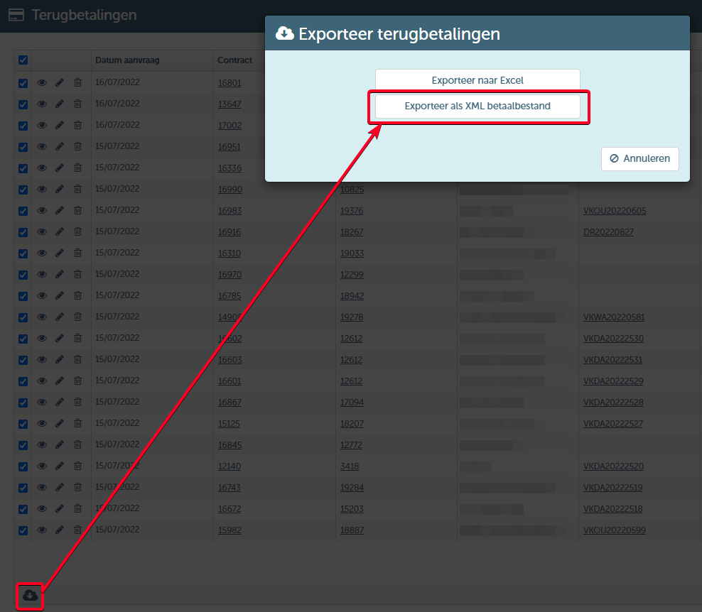 Indien de setting "XML export voor terugbetalingen" werd aangeschakeld, zal je naast het manueel verwerken van terugbetalingen ook een mogelijkheid hebben om de terugbetalingen te exporteren in XML formaat:
