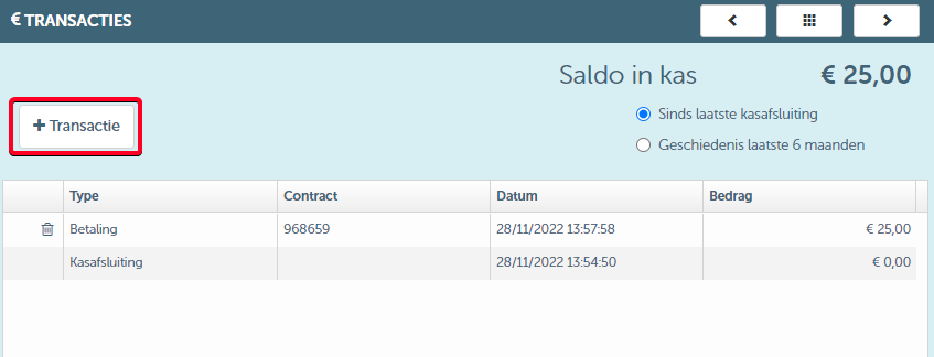 Via het beheerscherm voor kassa's kan je een kassa aanmaken en beheren. Hierbij is het mogelijk om transacties te registreren op een bepaalde kassa. Om dit te doen, open je de betreffende kassa en klik je op de tile "Transacties".
