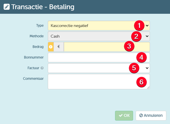 - Kascorrectie negatief - een transactie ter correctie van het kassatotaal in de negatieve zin (uithalen van cash)