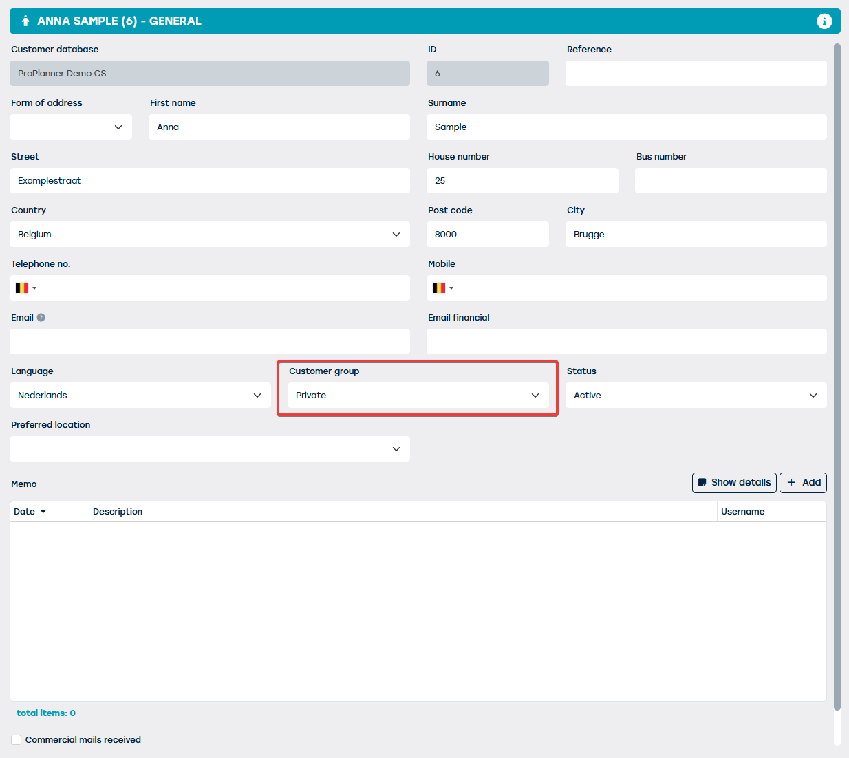 | 1 | Beschrijving | De naam die je aan de klantengroep wenst te geven. Deze kan je instellen in alle door ProPlanner ondersteunde talen. | Ja |