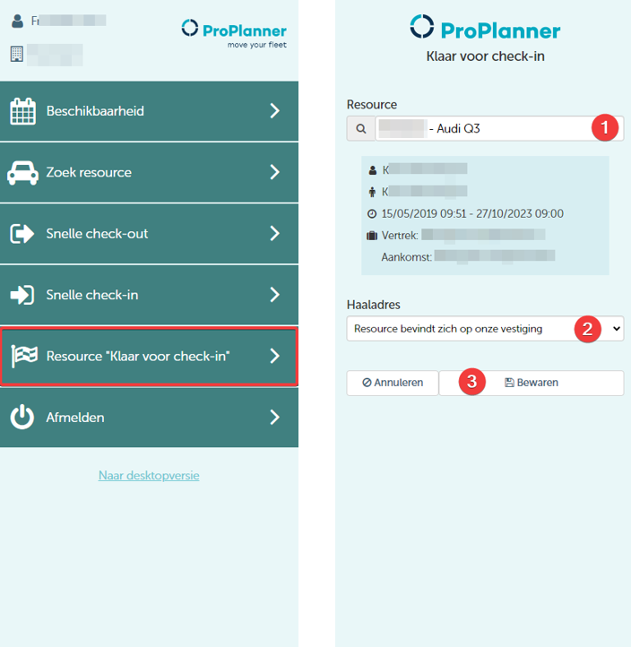 Indien zo ingesteld, kan je ook via ProPlanner Mobile (i.e. de ProPlanner webversie voor smartphone) een resource aanduiden als "Klaar voor check-in". Ook hier kan je na het zoeken van de resource (1) het haaladres aanpassen (2) indien dit nodig zou zijn. Wanneer je vervolgens op de knop "Bewaren" (3) klikt, zal het contract worden aangeduid als "Klaar voor check-in". Wat dit juist betekent, wordt verderop in dit artikel besproken.
