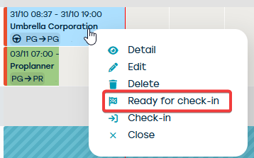 Wanneer een resource aan het rijden is (i.e. uitgecheckt) kan je via een rechterklik op het betreffende contract in het planningscherm de optie "Klaar voor check-in" aanduiden: