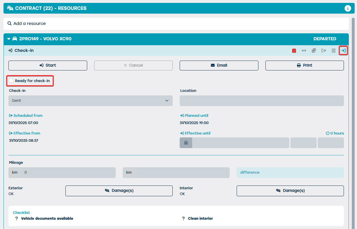Wanneer je de contractfiche opent van een uitgecheckt contract, kan je op de tile "Resources" op de subtile "Check-in" de checkbox "Klaar voor check-in" aanvinken: