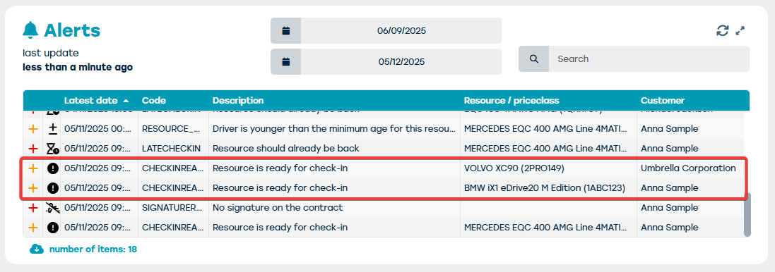 - Voor elk contract dat werd aangeduid als "Klaar voor check-in" zal er een alert worden aangemaakt op het homescherm. Deze alert wordt automatisch voltooid wanneer de betreffende resource wordt ingecheckt.