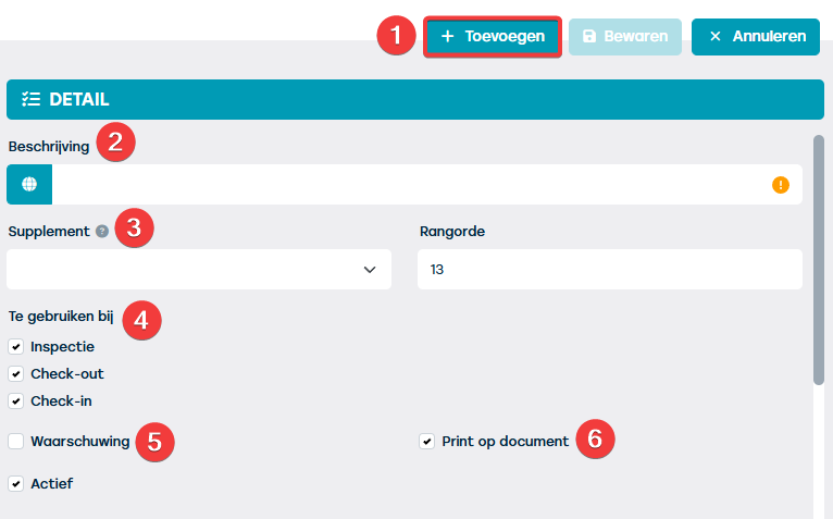 - Supplement (3) - Dit detail wordt zichtbaar wanneer de supplementenmodule in gebruik is, hier kan een supplement gelinkt worden aan het net gecreëerde checklist item. Het gekozen supplement wordt automatisch aangerekend indien dit item wél bij check-out maar niet bij check-in werd aangevinkt