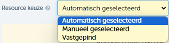 - Wanneer de resourceplanning automatisch werd herpland, zal de dropdown ‘automatisch geselecteerd’ weergeven. Deze planning werd niet specifiek gekozen door een gebruiker en mag vervolgens probleemloos gewijzigd worden