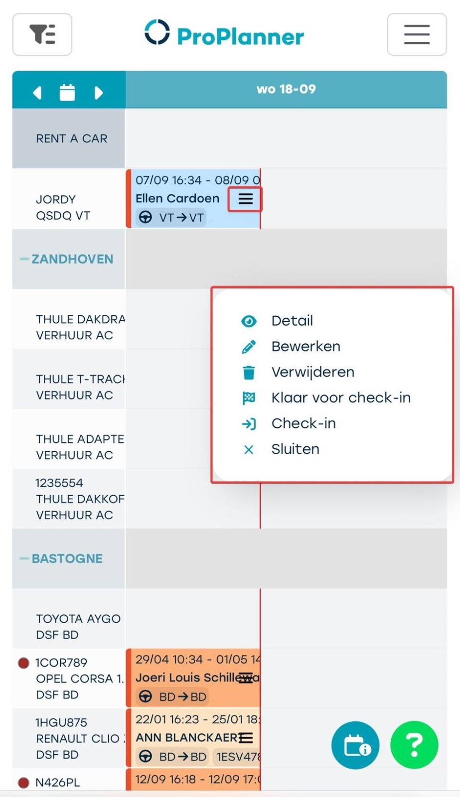 Op de planning kun je rechtermuisklik-acties, zoals in de webversie, oproepen door op het hamburgericoon te klikken dat op het contract wordt weergegeven.