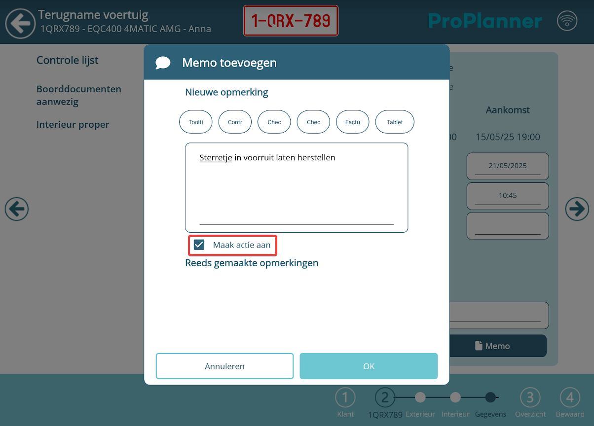 Tijdens het in- of uitchecken van een voertuig kunnen er situaties opgemerkt worden die verdere opvolging vereisen. Om te garanderen dat geen enkele actie verloren gaat, biedt ProPlanner de mogelijkheid om rechtstreeks vanuit de check-in of check-out op de tablet een actie aan te maken.