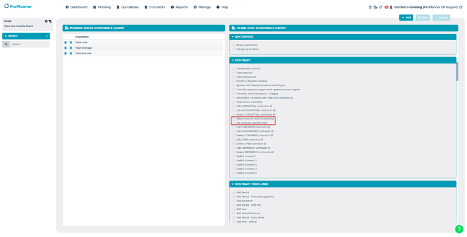 - Je kunt rechten toekennen per rol voor het beheren van prijzen die gekoppeld zijn aan specifieke contracten.