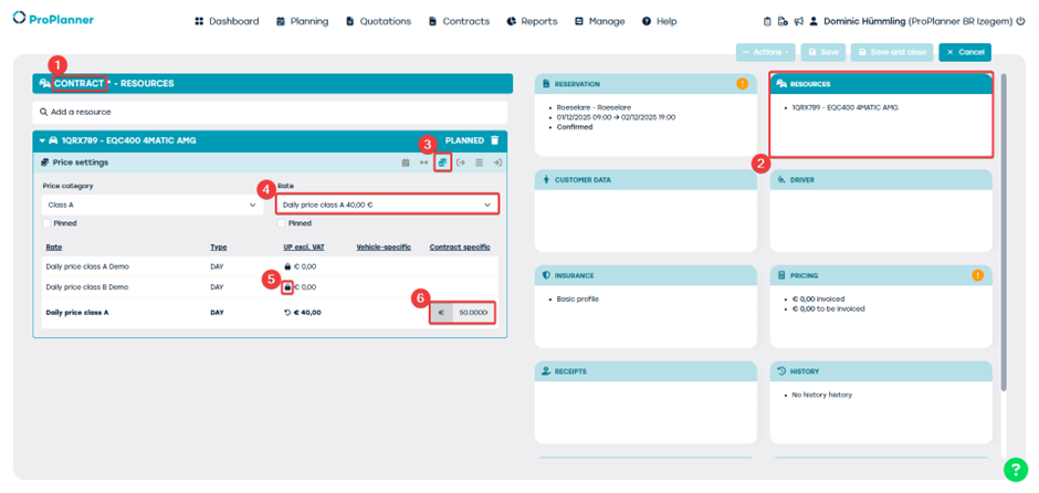 - Voeg via het slotje een contract specifiek tarief toe (indien rechten toegekend) (5 & 6).